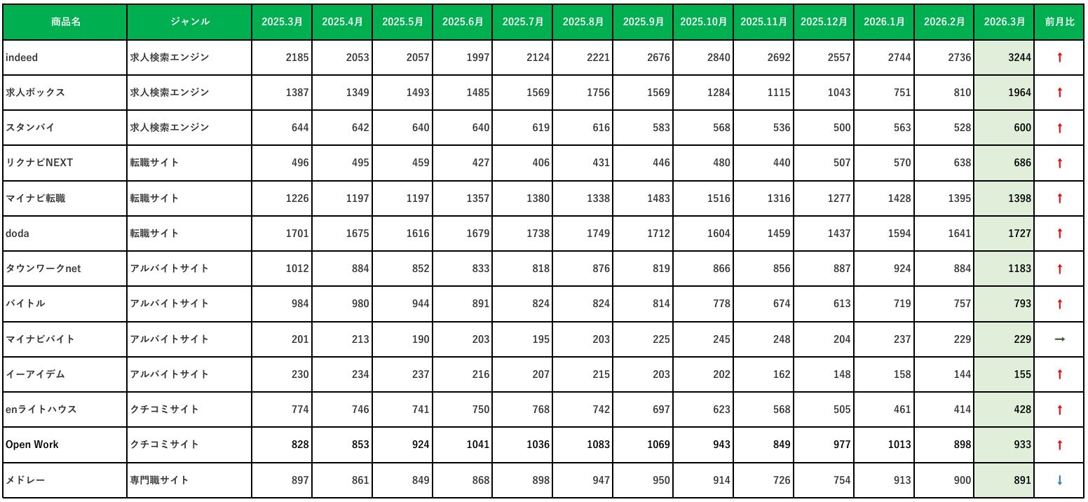 主要求人メディア月間ユーザー数/2026年3月
