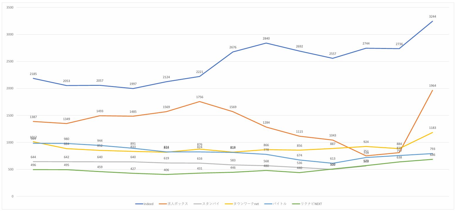 ほか、どの主要メディアも3月という求職者の動きが活発になる時期というのもあり全体的の増加。